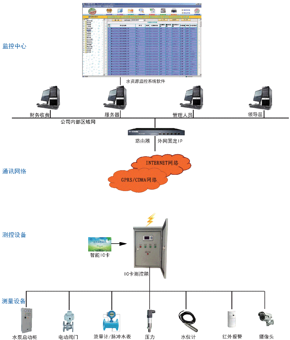 v 中心接收部分:中心服務(wù)器、固定外網(wǎng)IP、水資源管理系統(tǒng)軟件;