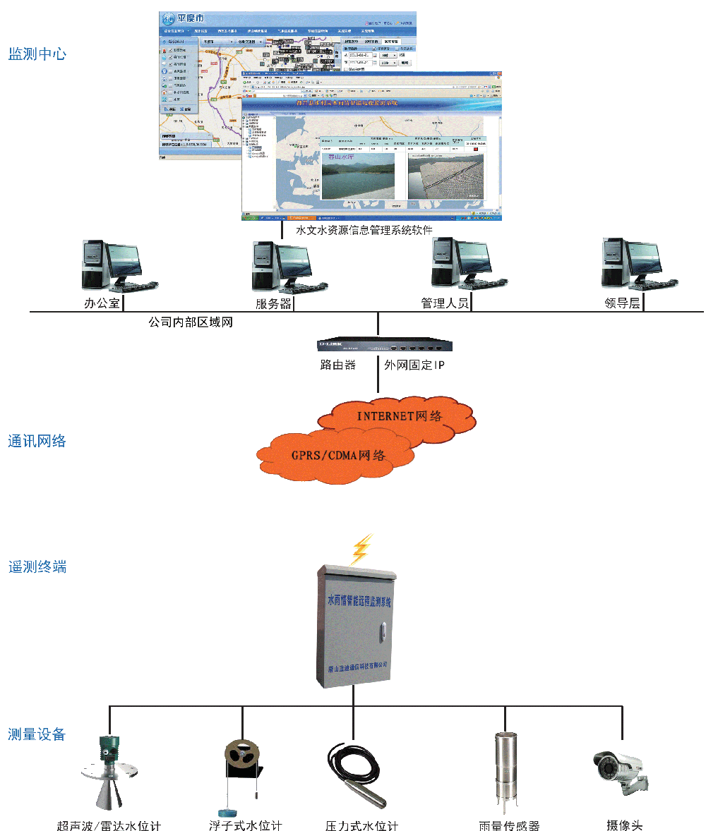 一、系統(tǒng)簡介 “水文水資源信息化管理系統(tǒng)”是一套率先以新的水文數(shù)據(jù)庫國家標準為基礎、采用了多項先進技術應用于水文信息化管理的應用解決方案,將較大地提高雨情、水情、旱情和災情信息的綜合利用率,為水文部門的調度決策提供科學依據(jù)。 二、系統(tǒng)組成 v 監(jiān)控中心:中心服務器、外網(wǎng)固定IP、水文水資源管信息化管理系統(tǒng)軟件; v 通信網(wǎng)絡: 基于移動或者電信的通信網(wǎng)絡平臺、北斗衛(wèi)星; v 遙測終端:水文水資源遙測終端RTU v 測量儀表:水位計、雨量傳感器、攝像頭; v 供電方式:市電、太陽能供電、電池供電。