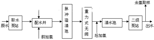 圖2 加氯工作流程圖 如圖2示:前加氯系統(tǒng)與后加氯系統(tǒng)共用一個氯氣氣源,共設(shè)兩組供氯氯瓶,兩組氯瓶互為備用.,根據(jù)氣瓶壓力自動切換。如當(dāng)正在使用的一組氯瓶出口管上的壓力小于某個值時,壓力式自動切換器將自動切換到另一組氯瓶,保證連續(xù)供氯。在加氯自動控制系統(tǒng)中,將PLC的模擬量輸出信號送給加氯機的模擬量輸入端,通過控制加氯機中執(zhí)行器的動作,控制水射器中的真空度,進而控制了加氯量的大小。加氯自動控制系統(tǒng)中還包括氯氣氣源的自動切換,漏氣自動報警和漏氯吸收裝置的自動控制。在加氯自動控制系統(tǒng)中,關(guān)鍵是對加氯機的控制。 自動控制氯系統(tǒng)可進一步配備計算機數(shù)據(jù)采集系統(tǒng),以便實現(xiàn)加氯間無人值班目標(biāo)。把出廠水中的余氯分析儀測定的數(shù)據(jù)送到加氯間,中心化驗室和調(diào)度室,以便值班人員可隨時監(jiān)測出廠水余氯值和調(diào)整余氯設(shè)定值。 3影響加氯自動控制的主要原因(1)采樣時間 采樣時間的長短,直接影響加氯的效果。為了達到自動控制的目的,要求氯氣經(jīng)充分混合后馬上檢查余氯值作為復(fù)合環(huán)控制的反饋信號。但現(xiàn)場中,有的工藝設(shè)計將混合接觸時間定的太長,對控制系統(tǒng)來說,即意味著純滯后時間的延長,造成測定結(jié)果不準確。因此,在后加氯的投加點和采樣點的選擇上,工藝設(shè)計時應(yīng)充分考慮自動控制的要求。通常情況下,后加氯在清水池進水管上,在氯氣與水充分混合后應(yīng)在盡可能短的時間內(nèi)取樣,水經(jīng)過加氯點到余氯分析儀處的水流時間一般不要超過5分鐘,在水與氯氣充分混合的前提下取樣時間越短越好?捎萌缦露N方法論縮短取樣時間:一是縮短取樣管的長度;二是加快取樣管中的水流速度如加大取樣水管排水分流管。(2)檢測設(shè)備 余氯分析儀的檢測值的正確性也是控制加氯的關(guān)鍵。由于余氯分析儀存在零點漂移,應(yīng)定期進行校正。同時在軟件編制時,對信號數(shù)據(jù)的處理也可考慮濾波、穩(wěn)定等形式進行適當(dāng)處理以增加數(shù)據(jù)的可靠性。(3)信號傳輸 主要是各底層設(shè)備的檢測信號要及時準確的傳輸?shù)絇LC中,然后進行處理。現(xiàn)場中大都設(shè)備采用標(biāo)準電流信號(0―20mA或4―20mA)。4 自動加氯系統(tǒng)的應(yīng)用 南方某一水廠,以江水為水源,水廠原設(shè)計規(guī)模為6萬m3/d。工藝流程如下示:
